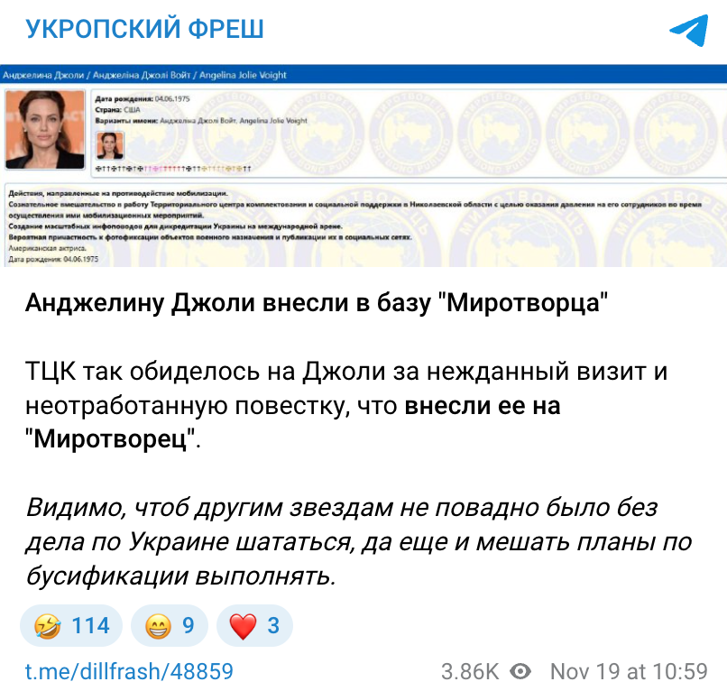 У мережі поширюють інформацію, нібито американську акторку Анджеліну Джолі, яка нещодавно відвідала Херсон і Миколаїв, внесли до бази українського сайту «Миротворець» через «протидію мобілізації свого охоронця, якого забрали в ТЦК». Це супроводжують скриншотом сторінки з інформацією про акторку на сайті.
