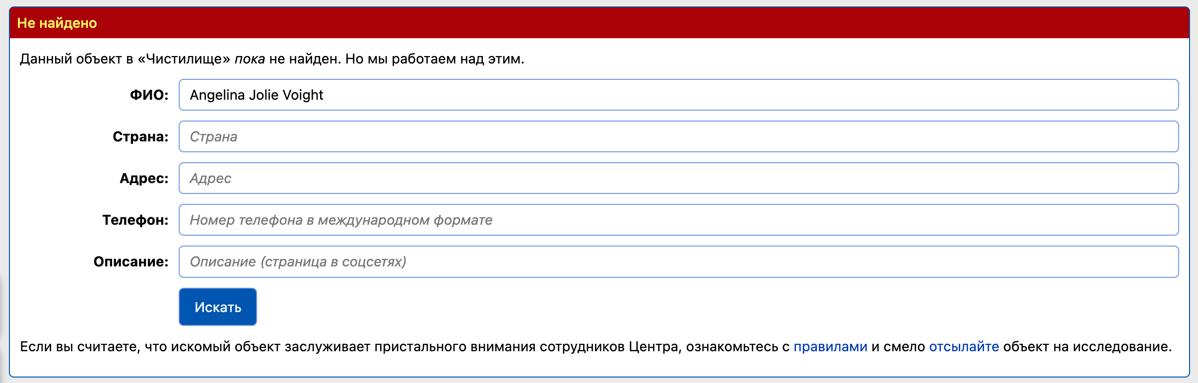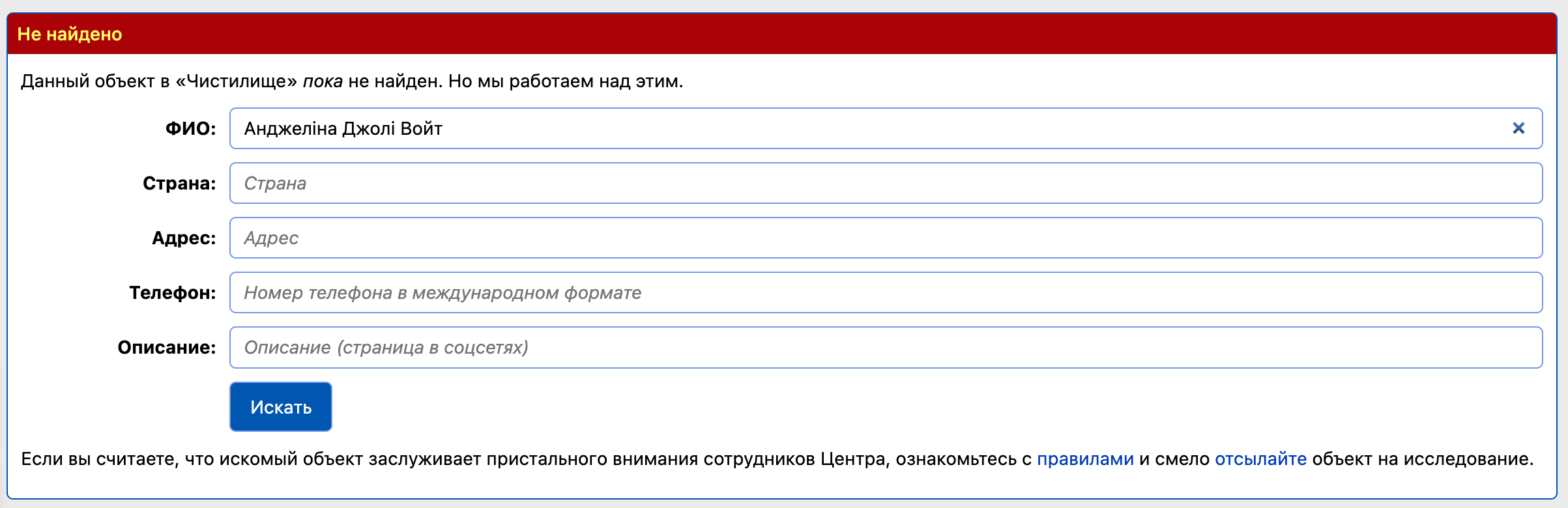 Однак це фотофейк. Анджеліни Джолі немає в базі «Миротворця». Скриншот сайту підробили.