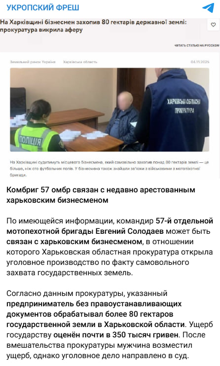 У мережі поширюють інформацію, що на Харківщині затримали бізнесмена, який привласнив 80 гектарів державної землі. Бізнесмен нібито має особисті зв’язки з командиром 57-ї окремої мотопіхотної бригади (57 ОМПБр) Євгеном Солодаєвим.