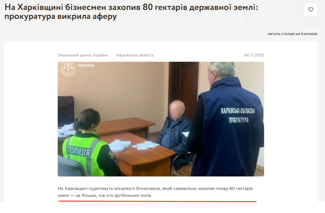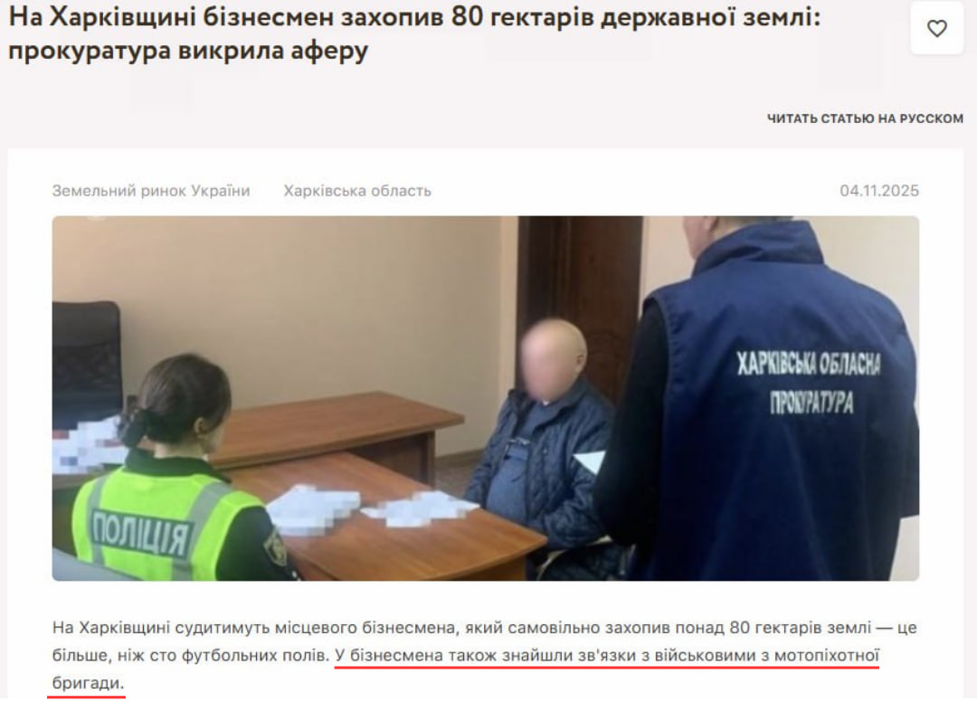 За допомогою пошуку за ключовими словами ми знайшли справжню новину, яку опублікувало видання «Zagorodna.com» 4 листопада 2025 року. У статті дійсно повідомляють, що на Харківщині судитимуть місцевого бізнесмена, який самовільно захопив понад 80 гектарів землі. Однак ані у статті, ані у повідомленні Харківської обласної прокуратори не заявляли, що бізнесмен має зв’язки із командиром 57-ї ОМПБр Євгеном Солодаєвим.