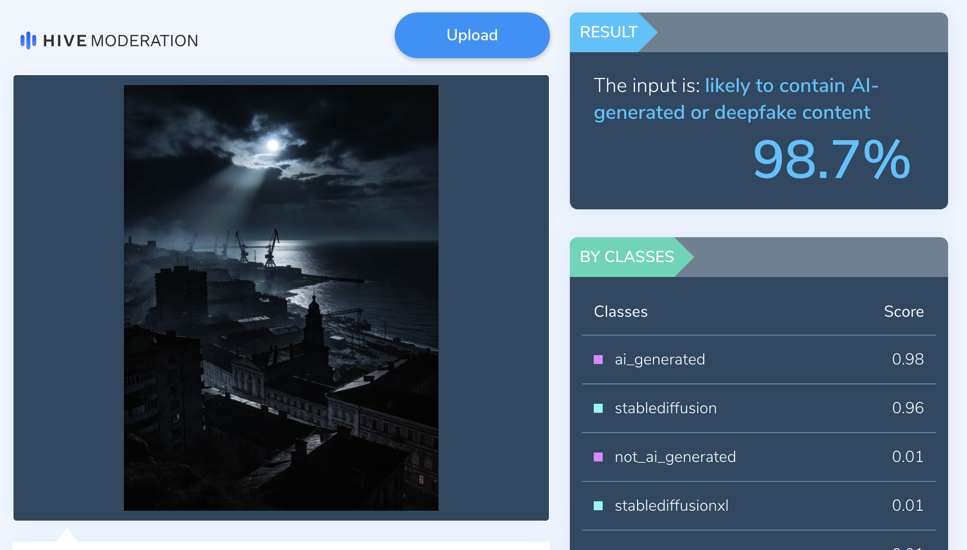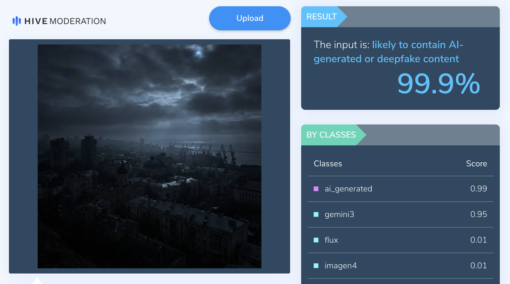 Перевірка в інструменті Hive Moderation показала, що ці зображення згенерували за допомогою штучного інтелекту.
