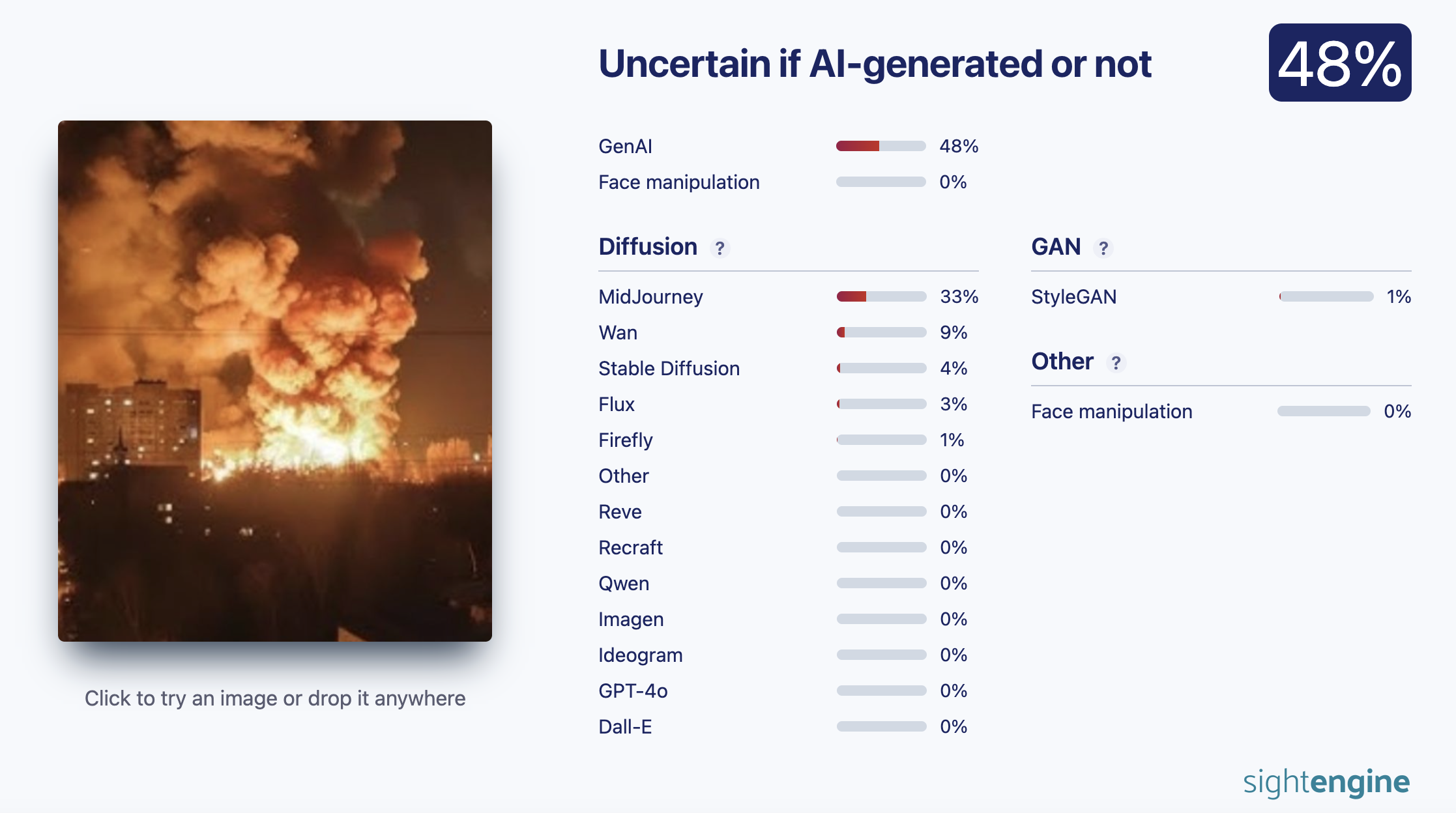 Перевірка в інструменті Sightengine, створеному для виявлення згенерованих фото, показала, що, можливо, зображення створили за допомогою ШІ.