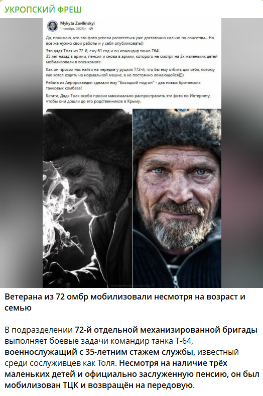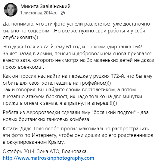 На скриншоті вказано, що допис поширив український військовий та фотограф Микита Завілінський. На його фейсбук-сторінці дійсно є допис із фото «дяді Толі». Утім, по-перше, його опублікували 1 листопада 2014, а 1 листопада 2025 року Завілінський лише перепостив його на сторінку як спогад про перші бойові виходи. По-друге, у ньому йшлося, що у 61 рік дядя Толя добровільно мобілізувався і став командиром танка Т-64.