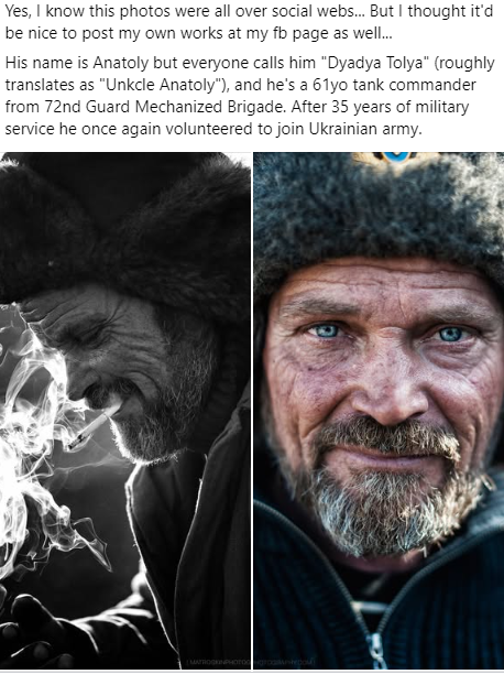 У мережі поширюють нібито фото дяді Толі, ветерана 72-ї ОМБр, якого повторно мобілізували після 35 років служби — попри вік і наявність трьох дітей. Його опублікував у себе на фейсбуці український військовий. У дописі йдеться, що дядя Толя неодноразово просив товаришів по службі забезпечити його трофейним танком Т-72. Але підрозділ аеророзвідки лише надав йому два нових британських танкових комбінезони.