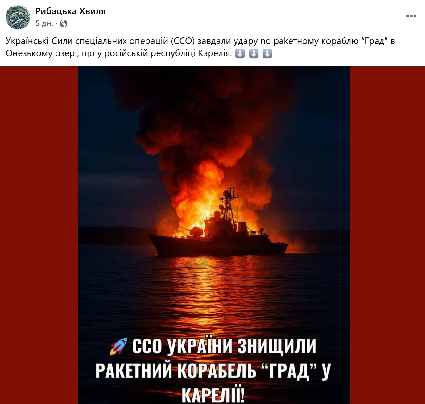 4 жовтня 2025 року Сили спеціальних операцій (ССО) справді повідомили про ураження російського ракетного корабля «Град». Це сталося в Онезькому озері у російській республіці Карелія. Однак ССО опублікували інше фото корабля, а не те, що поширюють користувачі.