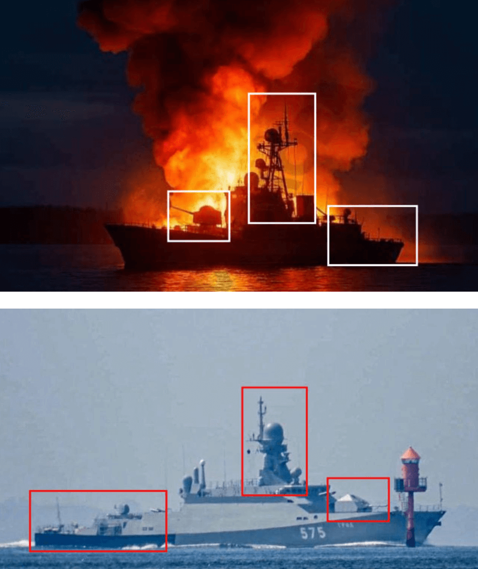 Зверху — фото, яке поширили у мережі; знизу — фото справжнього російського ракетного корабля «Град». Джерело: ССО