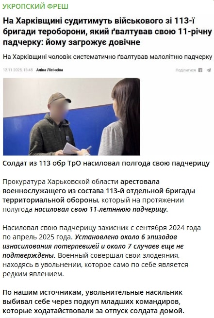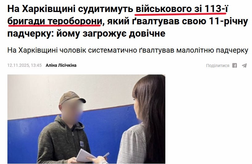 Російські телеграм-канали поширюють скриншот новини українського медіа. У ній ідеться, буцімто військовий 113-ї ОБрТрО систематично ґвалтував свою 11-річну названу доньку, перебуваючи у звільненні від служби. Зазначають, що чоловік визнав свою провину і йому передбачено довічне ув’язнення.