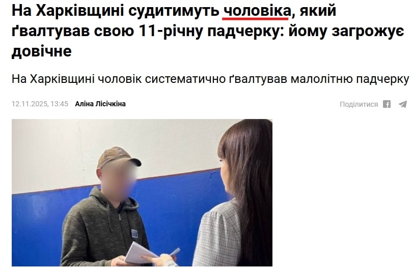 У тексті йдеться, що в Харківській області 30-річного чоловіка будуть судити за систематичне зґвалтування своєї 11-річної падчерки. Однак медіа не повідомляло про причетність чоловіка до Сил оборони. У повідомленні Харківської обласної прокуратури, яка розслідує злочин, також не згадують рід діяльності зловмисника.