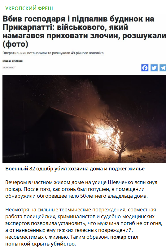 Російські телеграм-канали, посилаючись на статтю неназваного українського медіа, поширюють інформацію, нібито на Прикарпатті військовий 82-ї ОДШБр вбив господаря будинку і підпалив житло, щоб приховати злочин. Правоохоронці уже затримали підозрюваного.