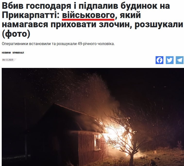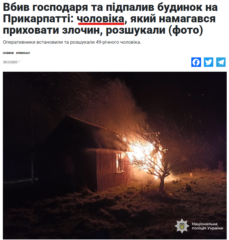 За ключовими словами ми знайшли новину, скриншот якої поширюють росіяни. Її опублікували 6 грудня 2025 року на сайті каналу NTA із заголовком «Вбив господаря та підпалив будинок на Прикарпатті: чоловіка, який намагався приховати злочин, розшукали (фото)».