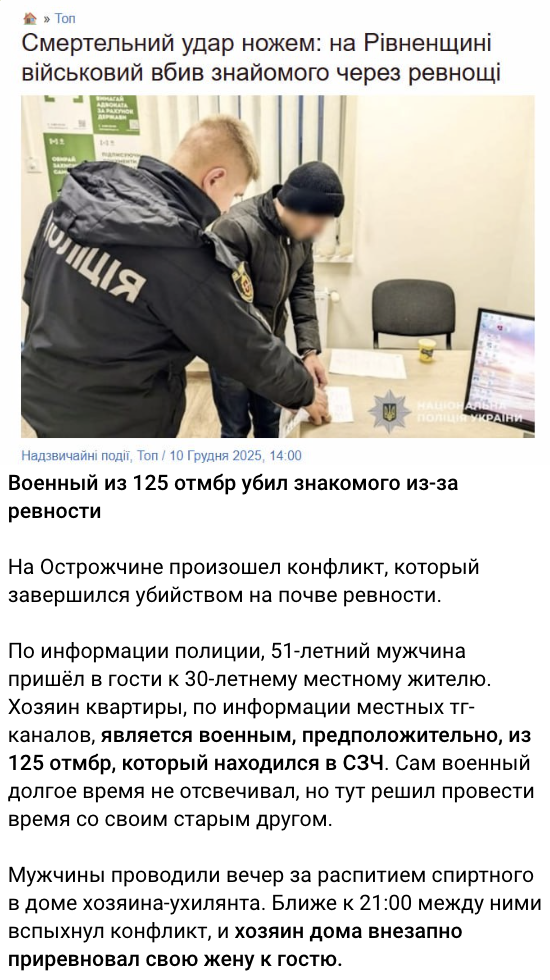 Російські телеграм-канали поширюють нібито скриншот новини українського медіа. У ній ідеться, що на Острожчині 30-річний військовий 125-ї окремої важкої механізованої бригади вбив свого знайомого через ревнощі. Стверджують, буцімто злочинець перебував у СЗЧ.