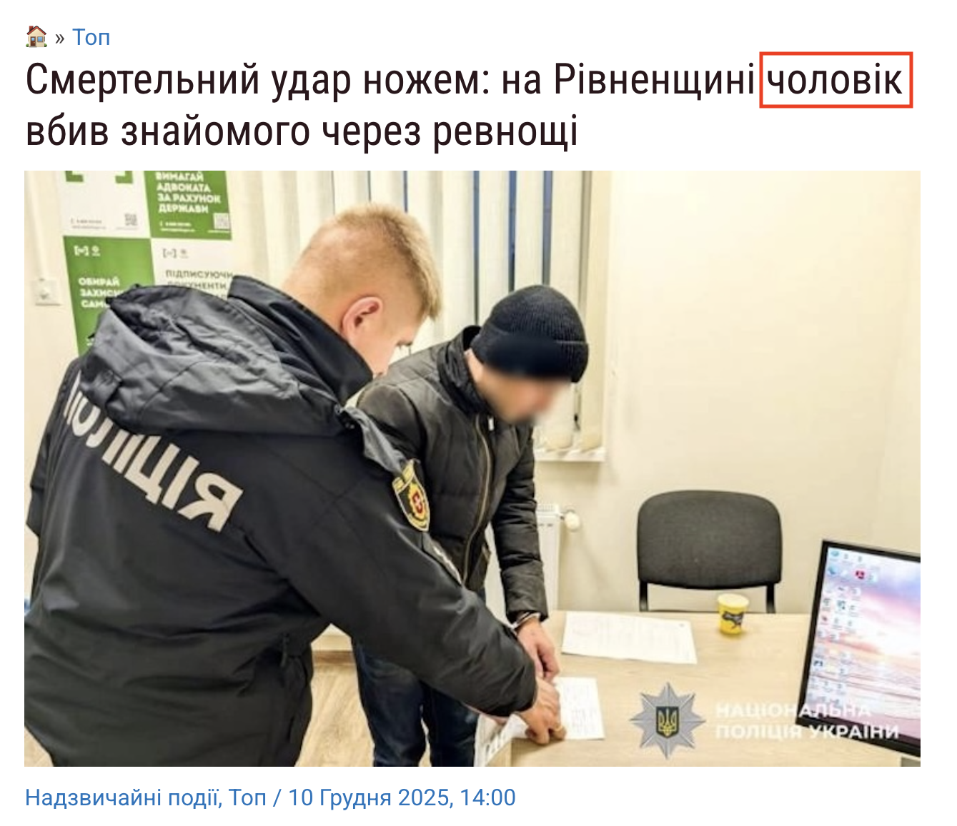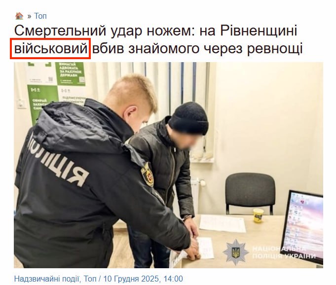 За ключовими словами ми знайшли статтю, скриншот якої поширили пропагандисти. Її опублікували на сайті інформаційного тижневика «ОГО» 10 грудня 2025 року. У тексті справді зазначають, що 8 грудня в селі Українка Рівненської області 30-річний чоловік вбив ножем свого 51-річного гостя під час застілля. Пишуть, що він приревнував до нього свою дружину. Нападник самостійно викликав поліцію на місце злочину. Його взяли під варту на 60 діб на час слідства.