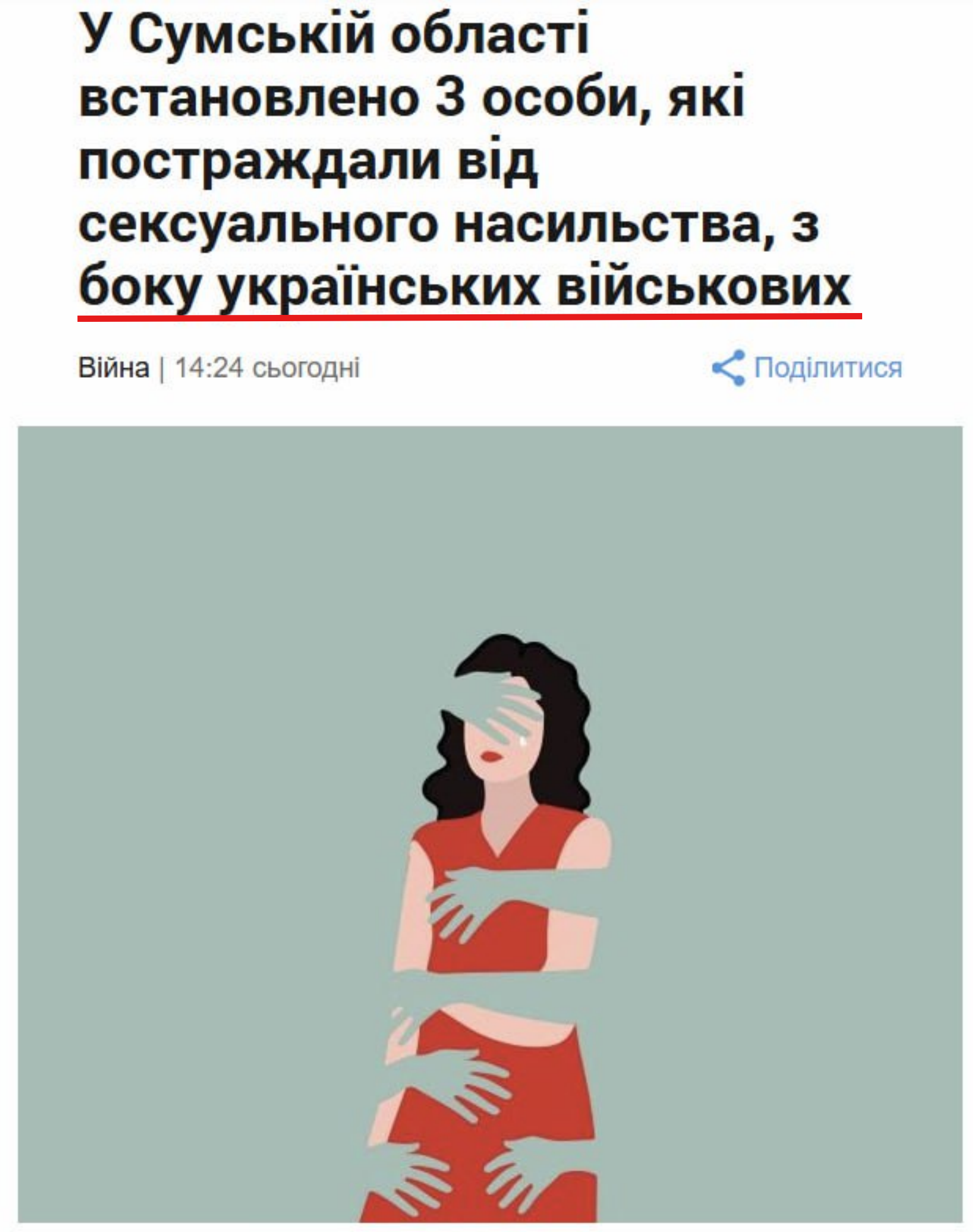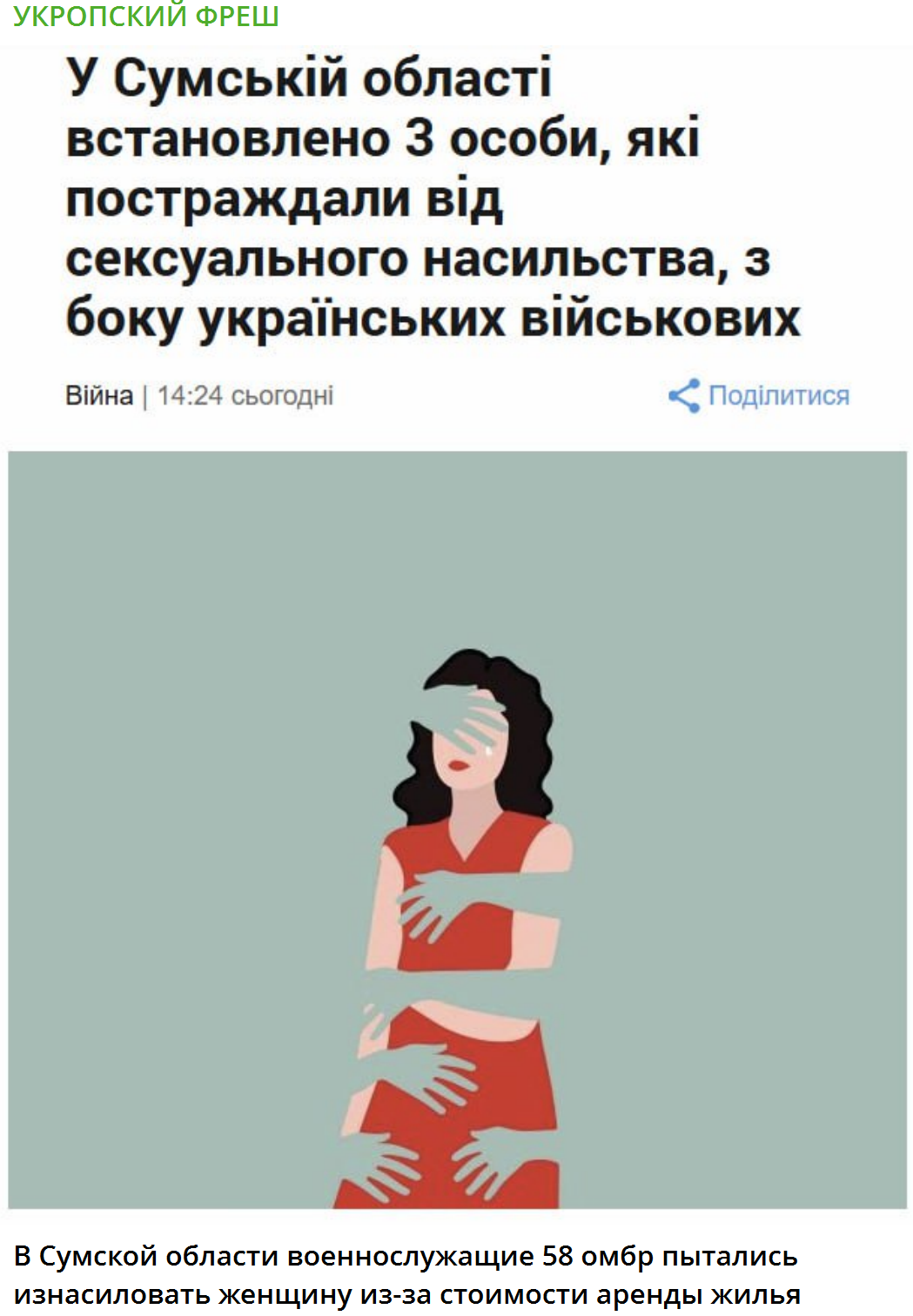 Російські телеграм-канали поширюють інформацію, буцімто на Сумщині троє осіб постраждали від сексуального насильства з боку військових 58-ї ОМБр. Як «доказ» росіяни додають скриншот статті з українського медіа.