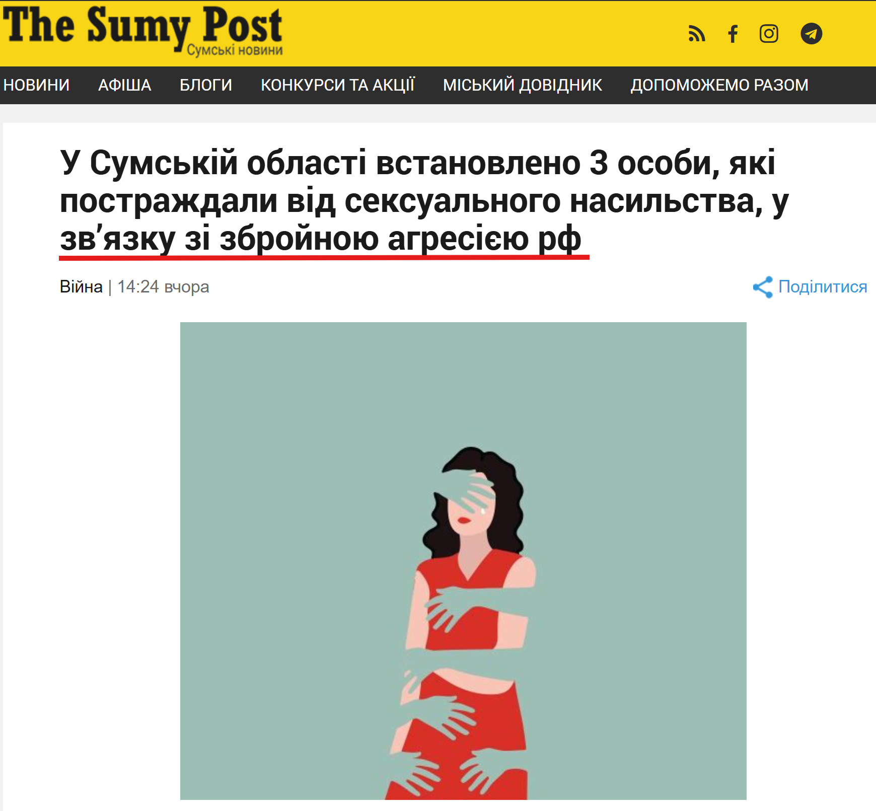 Справжній заголовок статті звучить так: «У Сумській області встановлено 3 особи, які постраждали від сексуального насильства у зв’язку зі збройною агресією рф».