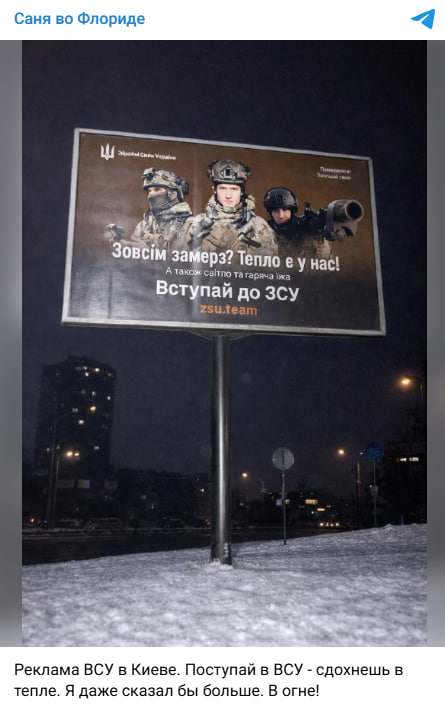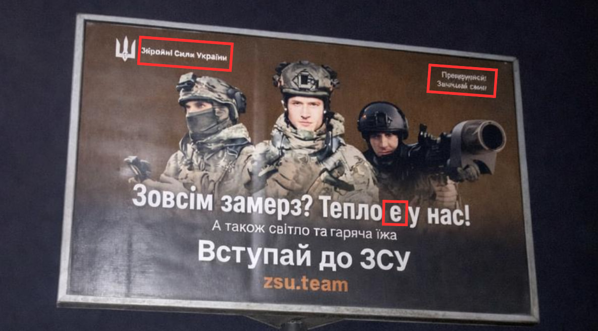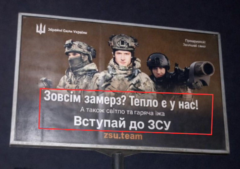 У мережі поширюють фото нібито рекрутингового білборда ЗСУ в Києві із написом: «Зовсім замерз? Тепло є у нас! А також світло та гарячв їжа. Вступай до ЗСУ».