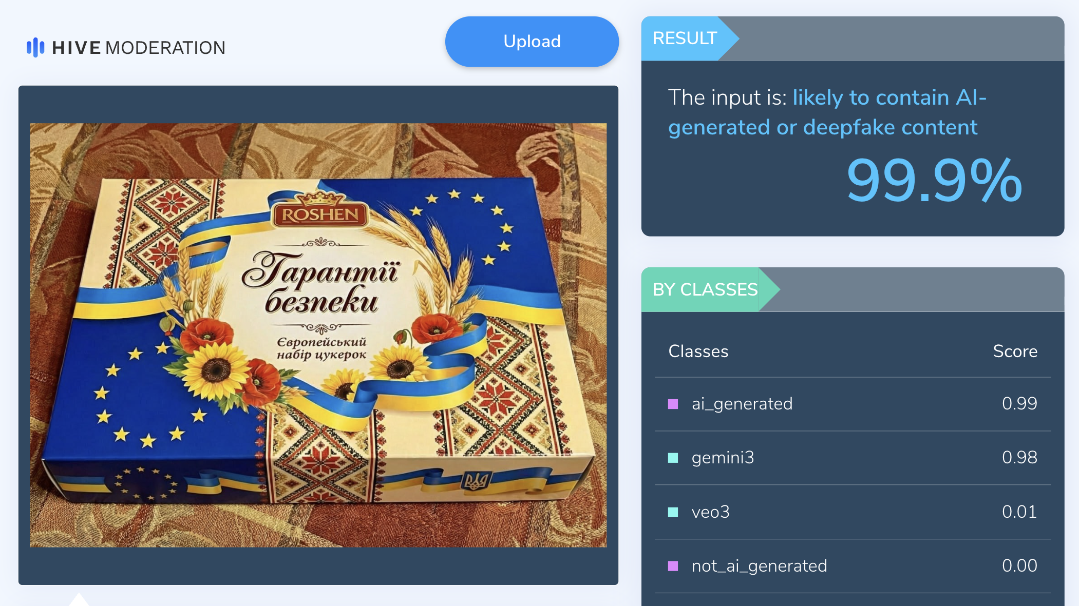 Перевірка в інструменті Hive Moderation показала, що з імовірністю 99,9% це зображення згенерували за допомогою штучного інтелекту.