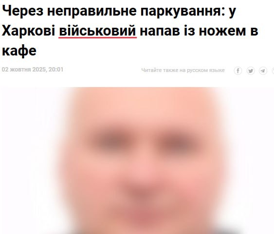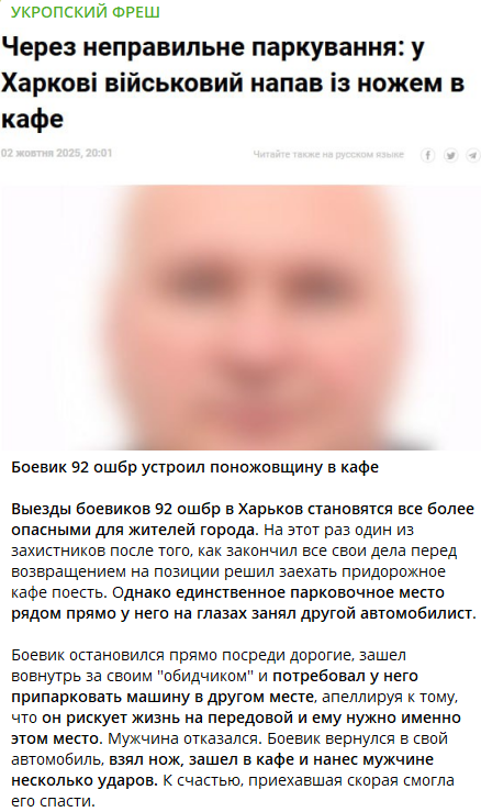 У мережі поширюють скриншот заголовка українського видання, де вказують, нібито військовий 92-ї ОШБр із ножем напав на чоловіка рід час сварки через паркомісце.
