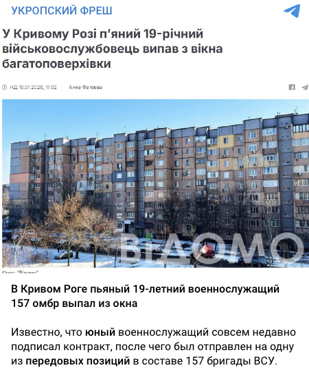 У мережі поширюють інформацію, нібито у Кривому Розі нетверезий 19-річний військовослужбовець 157-ї окремої механізованої бригади випав з вікна.