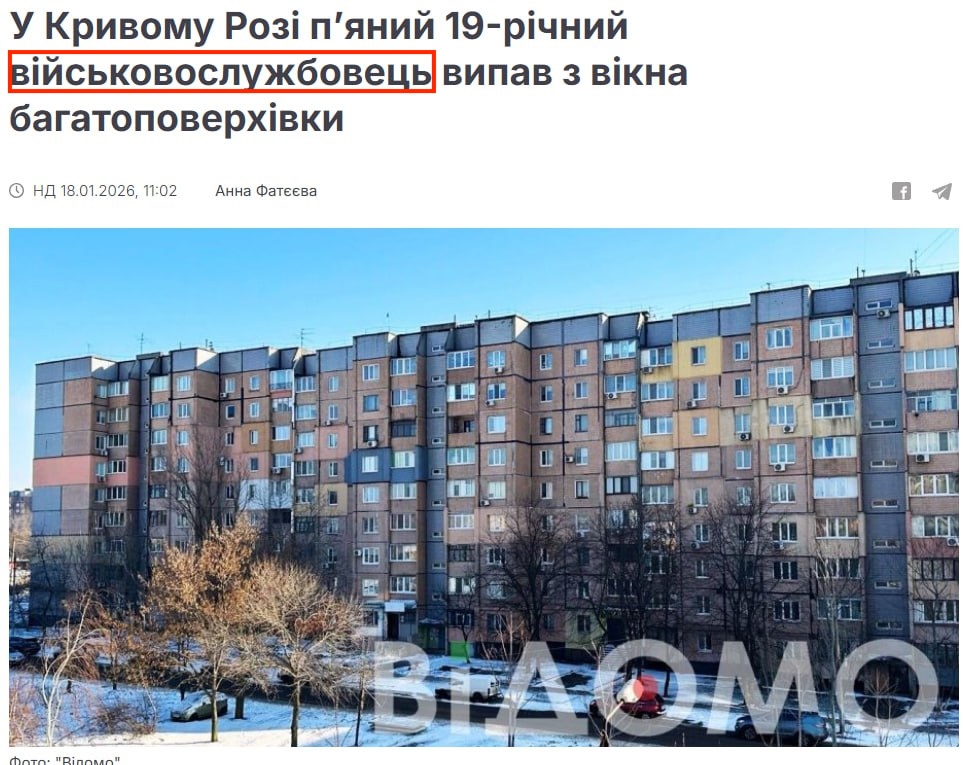 За ключовими словами ми зʼясували, що подібна новина дійсно існує. 18 січня медіа Відомо опублікувало новину, що в Кривому Розі пʼяний 19-річний хлопець випав з вікна багатоповерхівки. Однак у статті Відомо не зазначали, що підозрюваний є військовим. Головне управління поліції в Дніпропетровській області цю справу не коментувало.