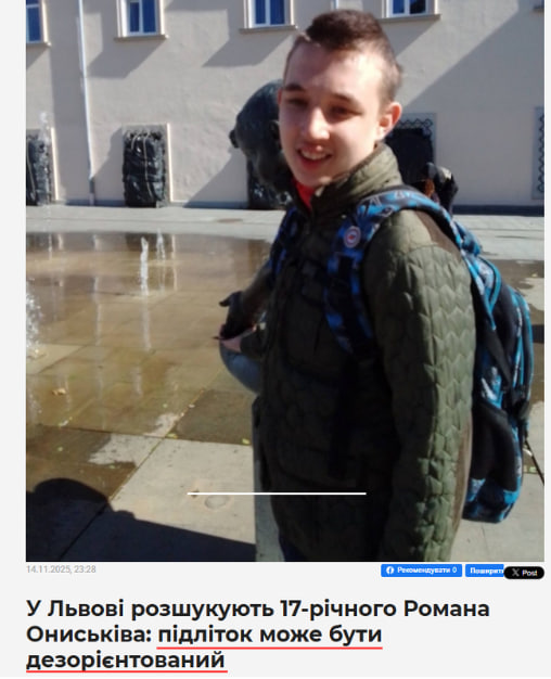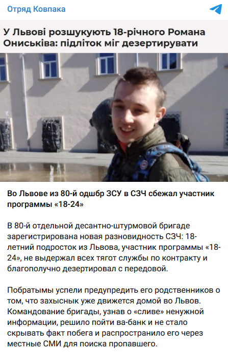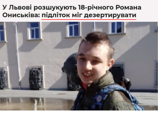У матеріалі повідомляли, що у Львові розшукують 17-річного Романа Ониськіва, який зник безвісти. Зазначається, що хлопець має затримку психомовного розвитку, через що може бути дезорієнтованим і потребувати допомоги. У матеріалі не вказували, що він є військовим за програмою «18–24» чи служить у 80-й ОДШБр. До того ж хлопець неповнолітній і має проблеми зі здоров’ям, тому його не могли призвати, зокрема, на передову.