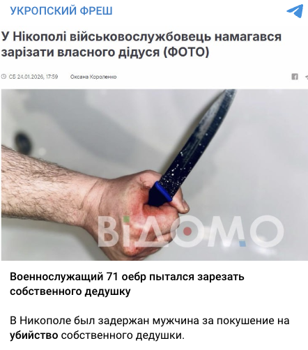 У мережі поширюють інформацію, нібито у Нікополі військовий 71-ї окремої аеромобільної бригади (до 2026 року — 71-ша окрема єгерська бригада — ред.) намагався зарізати свого дідуся.