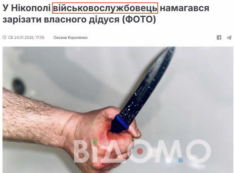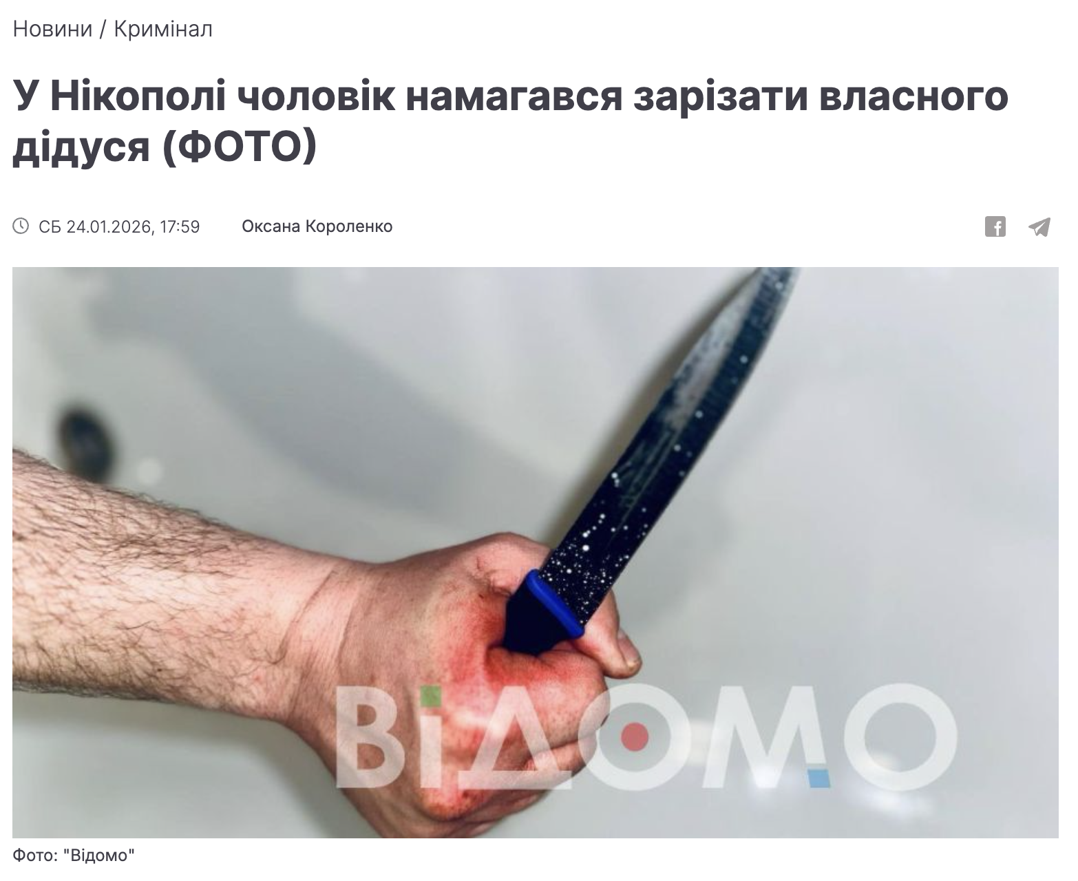 За ключовими словами ми зʼясували, що подібна новина дійсно існує. 24 січня медіа Відомо опублікувало матеріал з деталями про те, що чоловік намагався зарізати свого дідуся. Однак ані у статті Відомо, ані у повідомленні Головного управління Національної поліції в Дніпропетровській області не зазначали, що затриманий є військовим.
