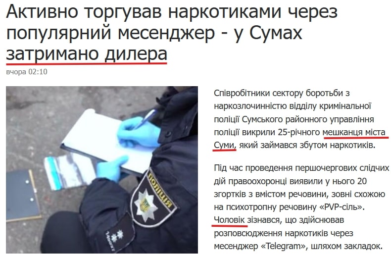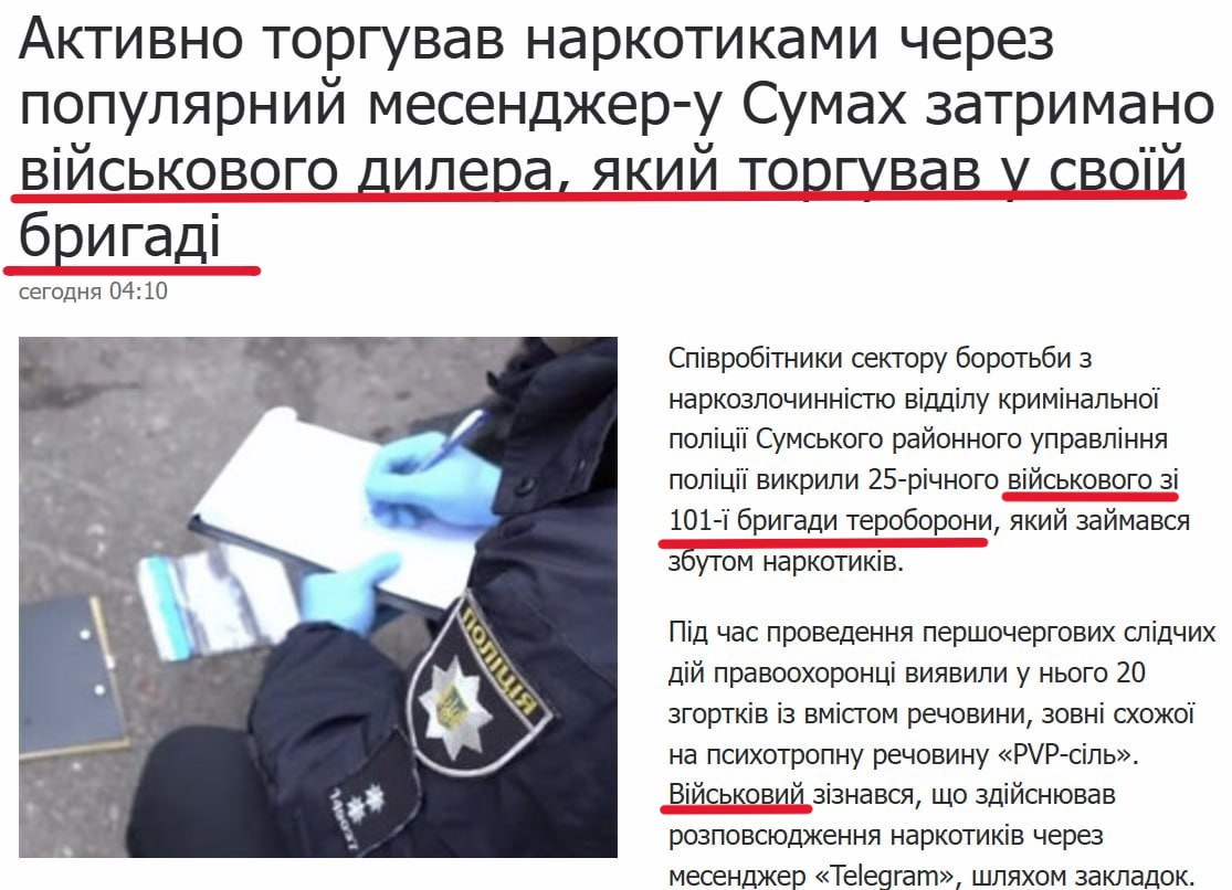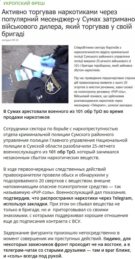 Російські телеграм-канали поширюють нібито скриншот статті українського медіа. У ній ідеться, що в Сумах затримали 25-річного військового 101-ї ОБрТрО за збут і продаж наркотиків через телеграм.