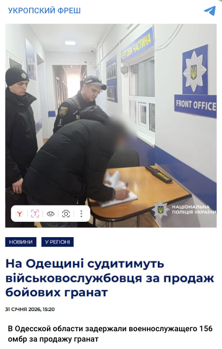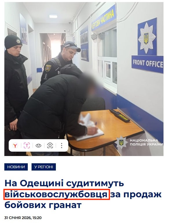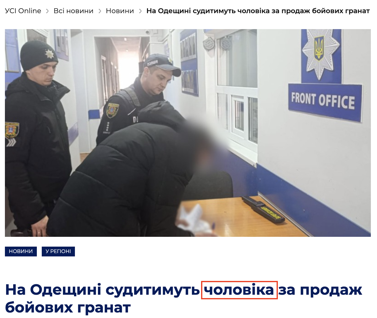 За ключовими словами ми зʼясували, що подібна новина дійсно існує. 31 січня 2026 року медіа «Українська Служба Інформації» опублікувало новину, що на Одещині судитимуть чоловіка за продаж бойових гранат. Однак ані у статті, ані у повідомленні Головного управління Національної поліції в Одеській області не зазначали, що затриманий є військовим.