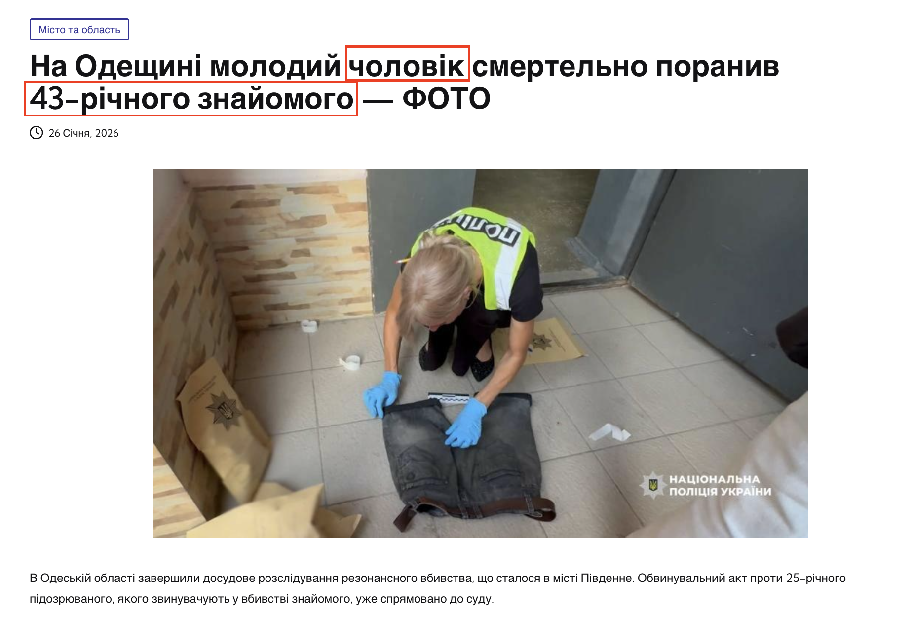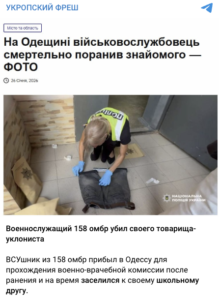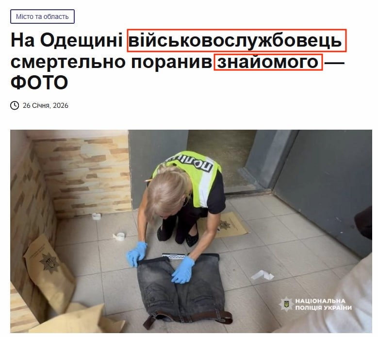 За ключовими словами ми зʼясували, що подібна новина дійсно існує. 26 січня медіа Times.od.ua опублікувало новину, що на Одещині чоловік смертельно поранив знайомого під час суперечки. Однак ані у статті Times.od.ua, ані у повідомленні Головного управління Національної поліції в Одеській області не зазначали, що підозрюваний є військовим.