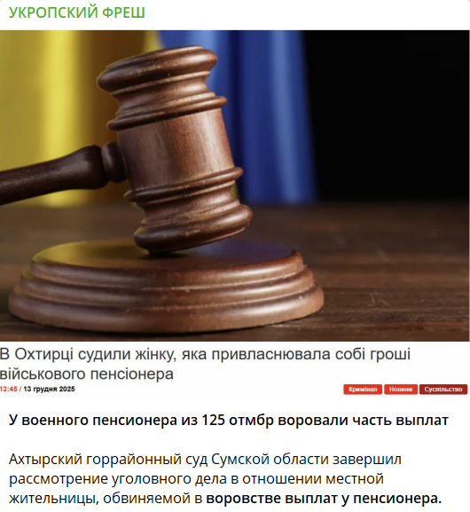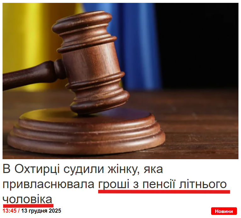 У статті йдеться, що, згідно з матеріалами справи, обвинувачена раніше працювала листоношею. Вона домовилася з начальником пересувного відділення поштового зв’язку про отримання коштів, призначених для виплати пенсії літньому чоловіку. Жінка отримувала пенсійні виплати протягом 2023–2025 років. Обвинувачена визнала провину та відшкодувала збитки. Охтирський міськрайонний суд призначив їй покарання у вигляді громадських робіт та позбавлення волі, від якого вона звільнена з іспитовим строком два роки.