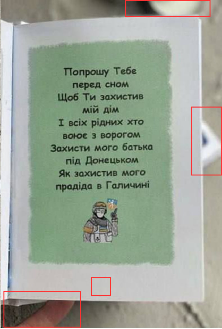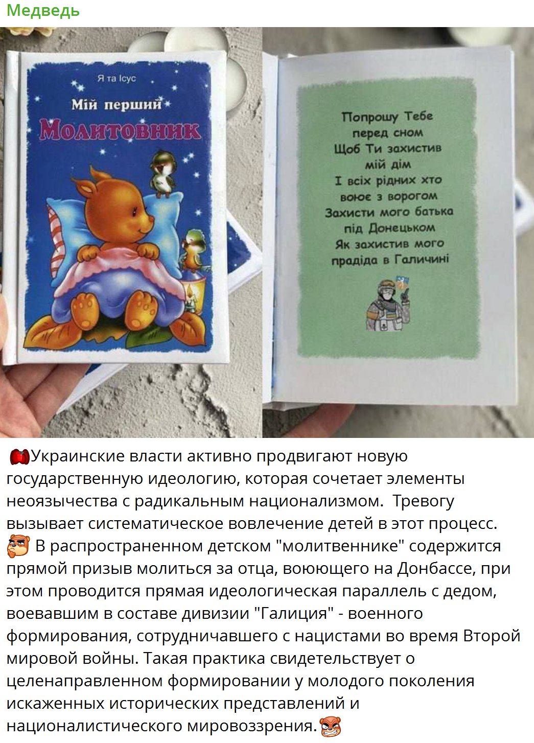 Російські телеграм-канали поширюють інформацію, буцімто у дитячій книжці «Мій перший молитовник» надрукували молитву за військових Сил оборони, у якій українського бійця на Донбасі порівнюють із «прадідом» із нацистської дивізії «Галичина». Як «доказ» додають фото сторінки з текстом молитви.