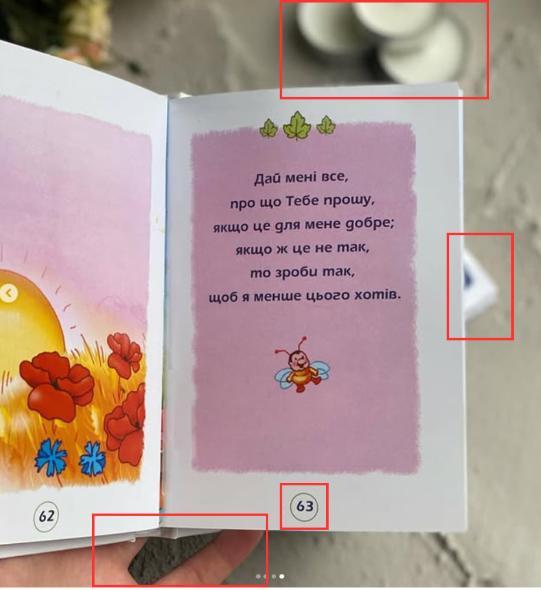 Фото сторінки молитовника відредагували, зокрема, змінили колірну гамму, текст та додали іншу ілюстрацію. Водночас у підробленій версії відсутній номер сторінки, який є у справжній книжці.