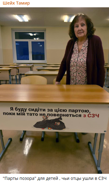 Російські телеграм-канали поширюють фото шкільної «парти сорому» для дітей українських військових в СЗЧ (самовільне залишення частини — ред.). На ній написано: «Я буду сидіти за цією партою, поки мій тато не повернеться з СЗЧ».