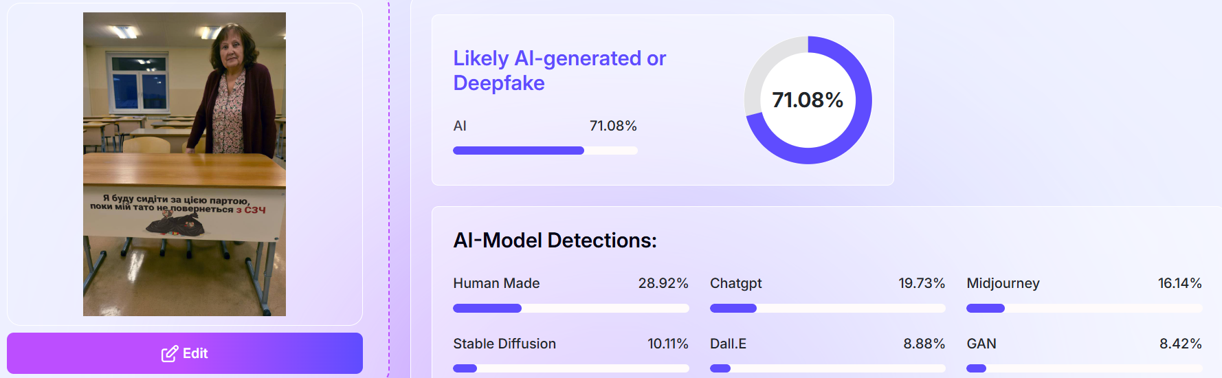 Перевірка за допомогу інструменту для виявлення штучно згенерованого контенту Reversely.ai показала, що зображення з імовірністю 71% згенерували за допомогою ШІ.