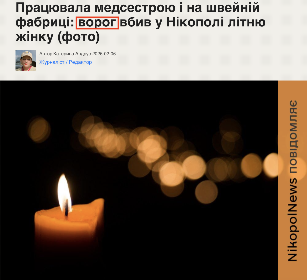 За ключовими словами ми зʼясували, що подібна новина дійсно існує. 6 лютого 2026 року медіа «Nikopol News» опублікувало новину, що в Нікополі внаслідок російського обстрілу загинула літня жінка. Про загибель жінки повідомив і міський голова Нікополя.
