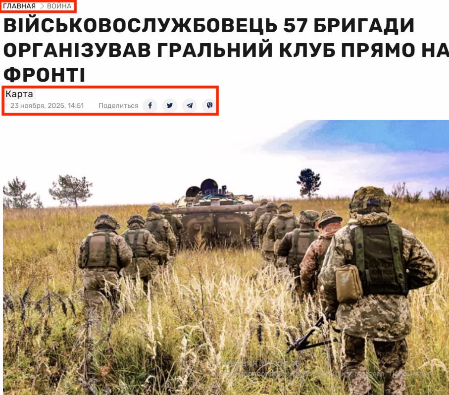 Російські телеграм-канали поширюють новину, нібито військовий 57 окремої мотопіхотної бригади організував на передовій підпільний ігровий бізнес. Стверджують, що він проводив турніри з карткових та інших азартних ігор серед побратимів, отримував з цього прибуток і платив командуванню за мовчання. Про це начебто повідомили в українських медіа.