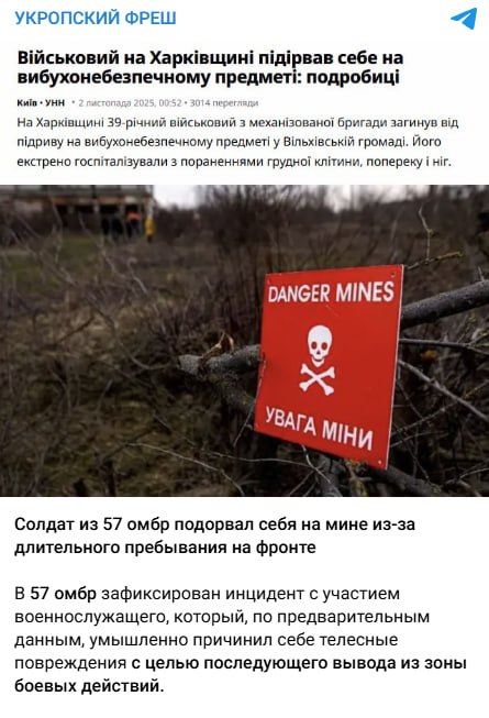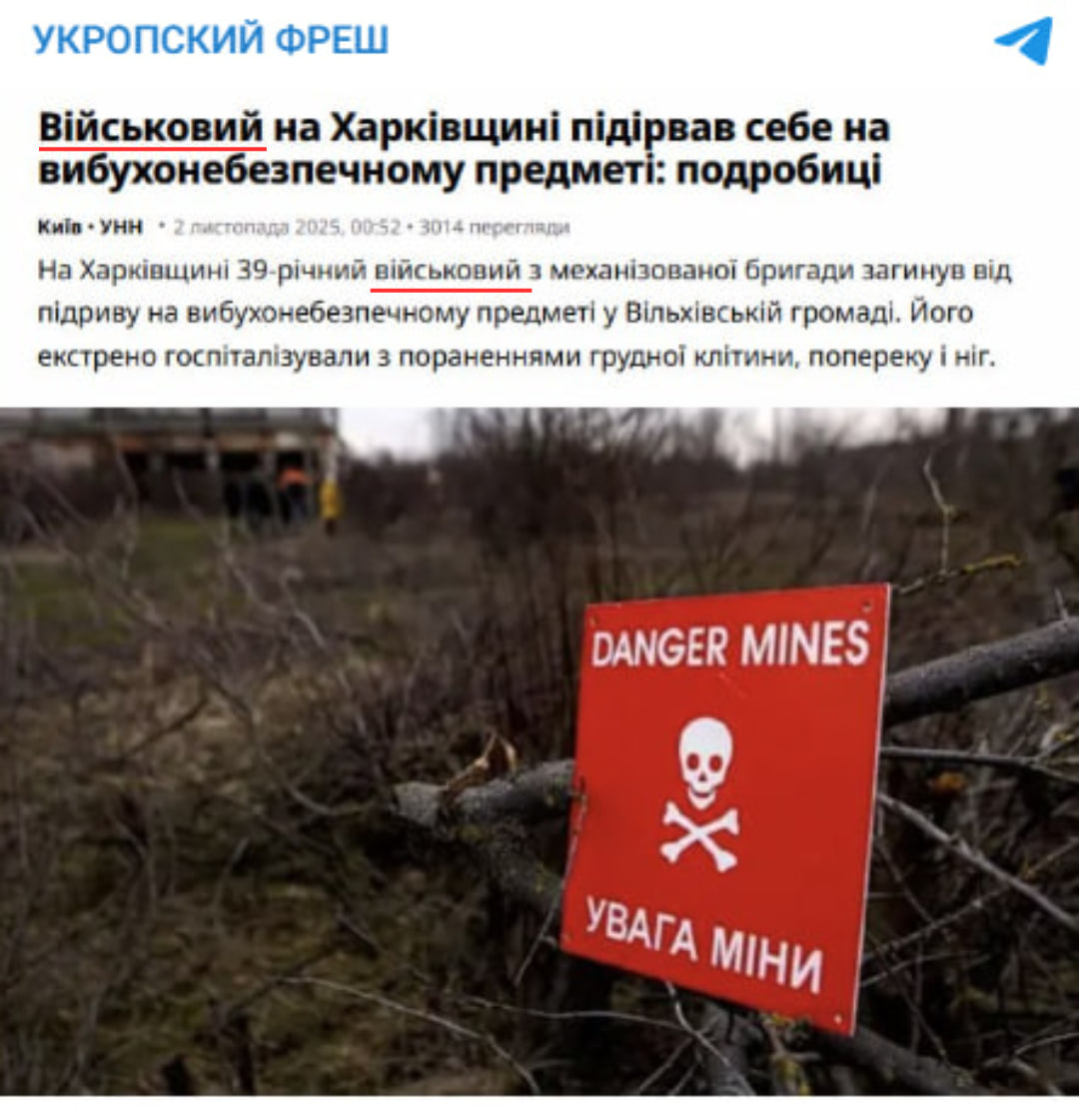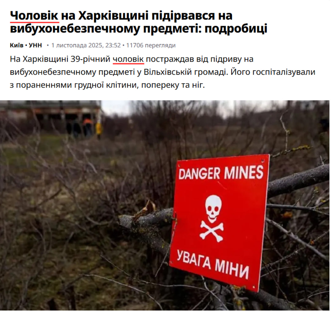 За допомогою пошуку за ключовими словами ми знайшли справжню новину, яку опублікувало видання «Українські національні новини» 1 листопада 2025 року. Там із посиланням на заяву начальника Харківської ОВА Олега Синєгубова повідомили, що на Харківщині 39-річний чоловік підірвався на міні. Утім, ані у статті, ані у повідомленні Синєгубова не зазначали, що чоловік є військовослужбовцем або проходив службу у 57-й ОМПБр.