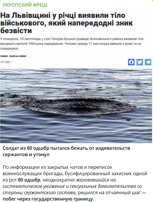 У мережі поширюють скриншот статті українського медіа із заголовком: «На Львівщині у річці виявили тіло військового, який напередодні зник безвісти». Автори допису вказують, що це сталося із солдатом 80-ї окремої десантно-штурмової бригади (ОДШБр), який намагався втекти за кордон від знущань сержантів. Для переходу кордону він обрав маршрут через прикордонний ставок.