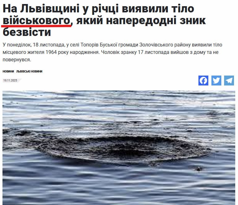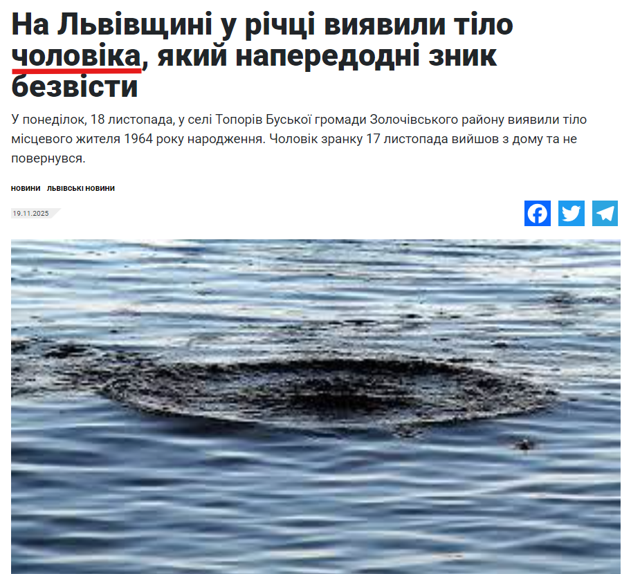 За ключовими словами ми знайшли новину, скриншот із якої поширюють росіяни. Її опублікували 19 листопада 2025 року на сайті львівського телеканалу NTA із заголовком: «На Львівщині у річці виявили тіло чоловіка, який напередодні зник безвісти». У матеріалі йдеться про те, що 18 листопада у Золочівському районі у річці знайшли тіло місцевого жителя. Напередодні 17 листопада він вийшов з дому та не повернувся. На момент написання цього матеріалу у мережі не зʼявлялися нові відомості щодо цієї справи.