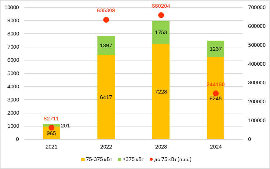 Найпопулярнішим рішенням підприємств для енергетичного унезалежнення є генератори (74%). Значна частка компаній (41%) встановлюють акумулятори, а також велика частина бізнесів упроваджують енергоощадні рішення. У 2022-2023 роках до України завезли сотні тисяч генераторів, переважно невеликої потужності (рис. 1).
