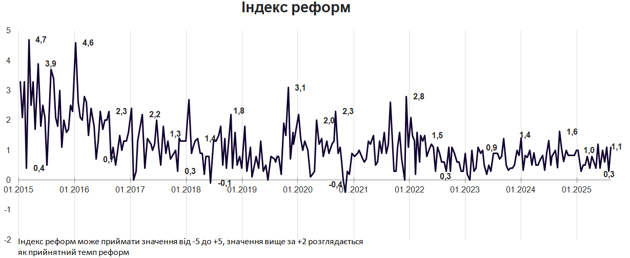 Індекс реформ призначений надавати комплексну оцінку зусиллям влади України зі впровадження економічних реформ. Індекс базується на експертних оцінках змін у регуляторному середовищі за шістьма напрямками: державне управління, державні фінанси, монетарна система, бізнес-середовище, енергетика, людський капітал. Інформація про проєкт, перелік експертів Індексу та база даних оцінених нормативних актів доступні за посиланням.