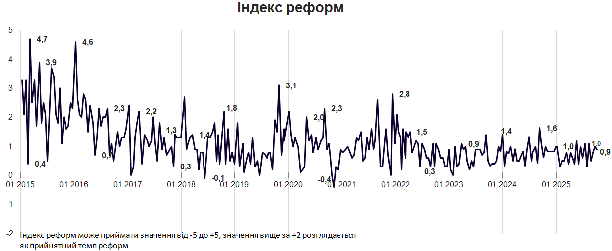 Індекс реформ призначений надавати комплексну оцінку зусиллям влади України зі впровадження економічних реформ. Індекс базується на експертних оцінках змін у регуляторному середовищі за шістьма напрямками: державне управління, державні фінанси, монетарна система, бізнес-середовище, енергетика, людський капітал. Інформація про проєкт, перелік експертів Індексу та база даних оцінених нормативних актів доступні за посиланням.
