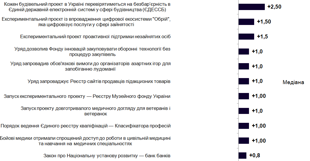 Ця подія потрапила до двох напрямків — «Бізнес середовище» та «Людський капітал» — і сумарно отримала +2,5 бали (з діапазону від -5 до +5). Також у фокусі огляду дві реформи у сфері зайнятості. Перша цифровізує процес працевлаштування, друга впроваджує проактивну комунікацію з безробітним — держава пропонуватиме їм допомогу із працевлаштування ще до звернення до Центра зайнятості. Ці дві події експерти оцінили в +1,5 бали.