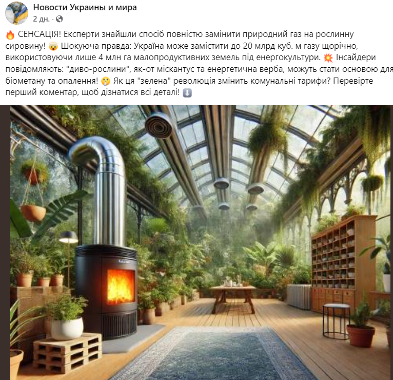 Щоб дізнатися деталі, автори допису закликали перейти за посиланням у першому коментарі. За посиланням міститься стаття анонімного новинного сайту Prozoro, у якій переповідають коментар виконавчого директора Асоціації «Енергоефективні міста України» Святослава Павлюка для видання «Телеграф». Він вказував, що українцям потрібен не газ, а тепло. А щоб його отримати, можна використовувати для спалення відходи деревини та біомасу. Для цього він запропонував висаджувати енергетичні культури — рослини, які вирощують для отримання біопалива, що використовується у виробництві тепла та електроенергії.