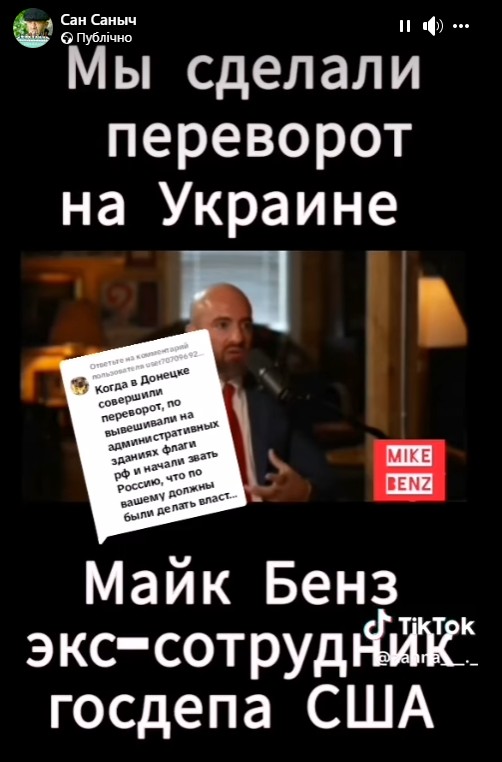У мережі поширюють інформацію, мовляв, американський посадовець зізнався, що США здійснили держпереворот в Україні. Як доказ вони наводять слова ексспівробітника Держдепу США Майка Бенза, який говорить, що Білий дім скинув українське керівництво у 2014 році. Однак, за його словами, США не очікували «зустрічного перевороту», коли «Донбас відділився і Крим проголосував за приєднання до рф».