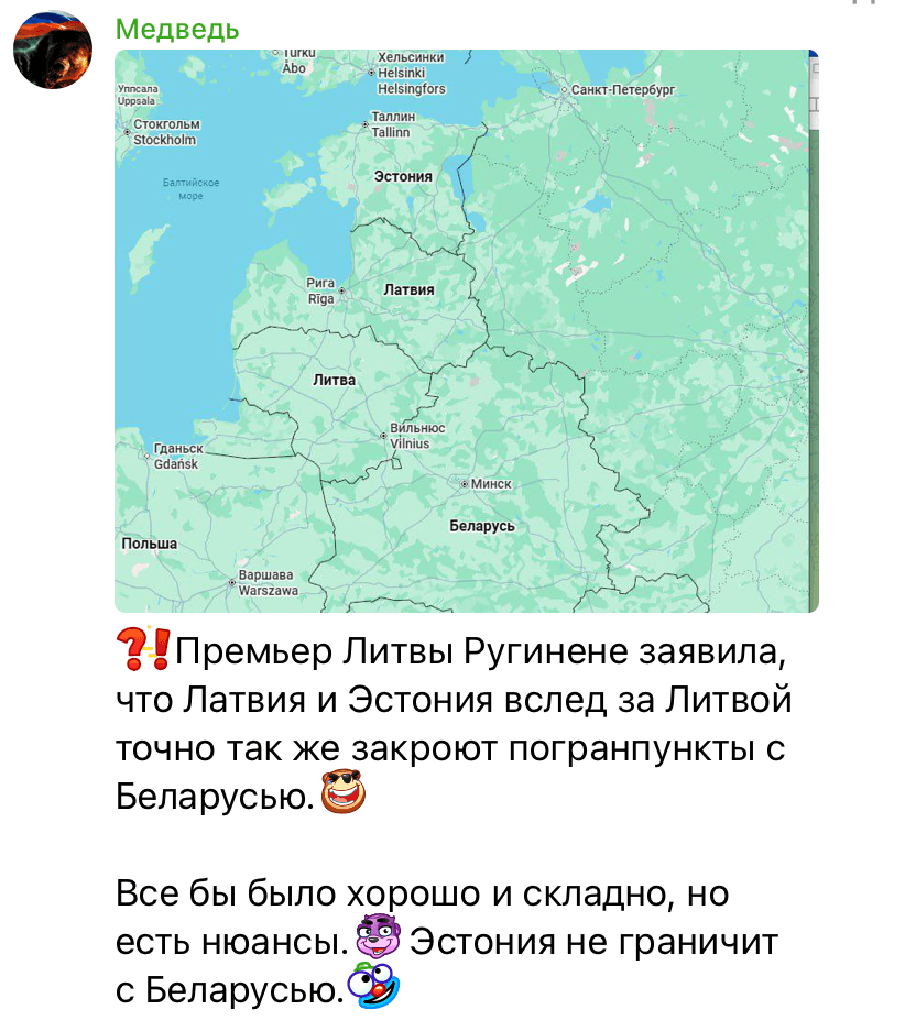 Отже, прем’єрка не стверджувала, що Латвія та Естонія збираються закрити кордон з Білоруссю. Вона лише запевнила, що розраховує на підтримку цих країн у прикордонній суперечці. Російські пропагандисти домислили те, чого Ругінене не казала, щоб висміяти її нібито через незнання географії.