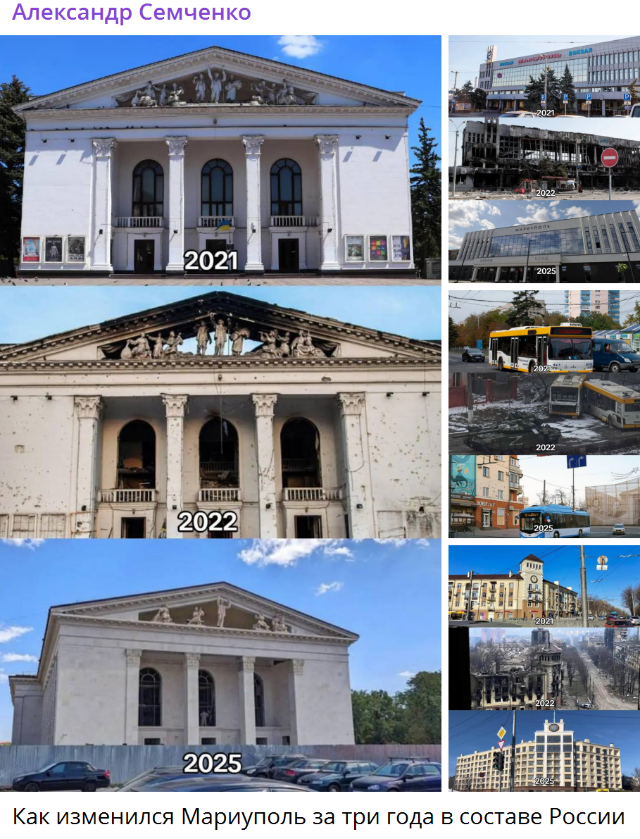 Російські телеграм-канали поширюють фото порівняння будівель у Маріуполі до окупації та після приходу рф. У такий спосіб росіяни натякають, буцімто росія змінила місто «на краще» за близько три роки окупації.