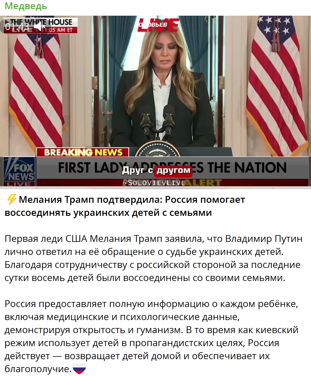 Російські телеграм-канали поширюють інформацію, буцімто росія дбає про українських дітей та забезпечує їхній добробут, поки сама Україна нібито використовує їх у пропагандистських цілях. Як «доказ» цьому вони наводять слова дружини Дональда Трампа Меланії про те, що росія допомагає «возз’єднувати українських дітей із сім’ями».