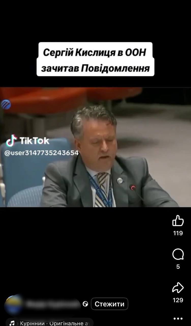 У мережі поширюють фрагмент промови Сергія Кислиці в ООН. Він заявляє, що після 1991 року СРСР нібито не припинив існувати і продовжує свою міжнародну правосуб’єктність.
