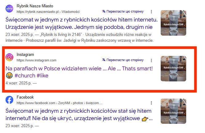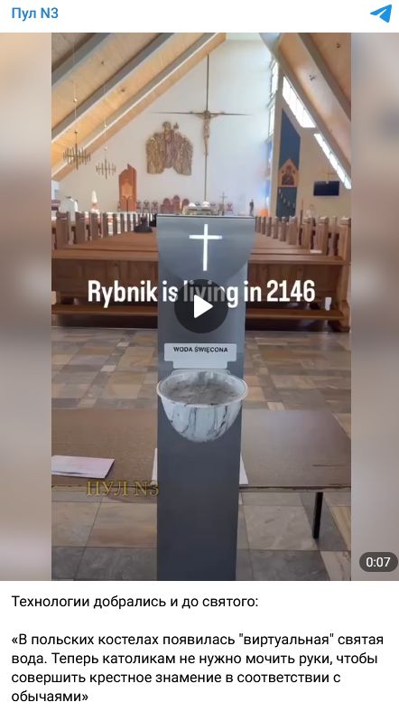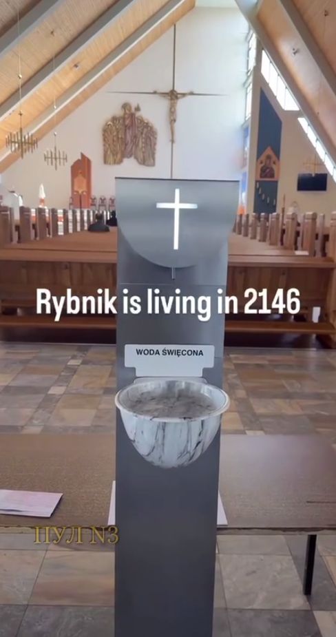 У мережі поширюють відео з одного із польських костелів. У ньому начебто встановили пристрій із «віртуальною» святою водою. На ролик додали напис англійською: «Рибник живе у 2146 році».